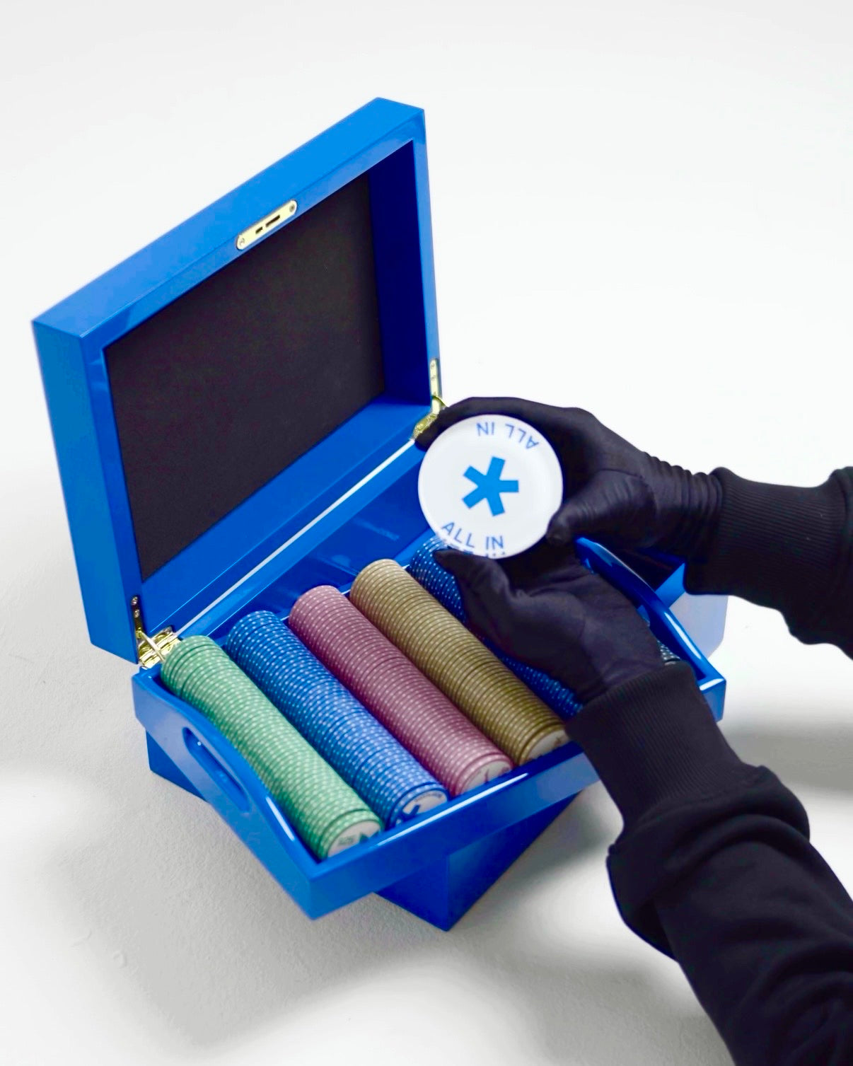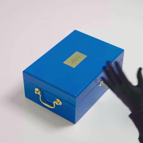 CONTEÚDO: MALETA DE MADEIRA LAQUEADA EM AZUL BOSY*COYS, 500 FICHAS PERSONALIZADAS, 2 BARALHOS, 1 BOTÃO DE ALL IN 1 BOTÃO DE DEALER.